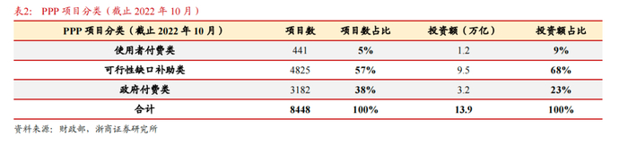 作为政府和社会资本合作模式,地方财政肩负一定支出责任,被视为一种广义财政工具。根据财政部PPP中心发布的《全国PPP综合信息平台管理库项目2022年10月报》披露,自2014年以来,PPP累计入库项目超过1万个,投资额达16.6万亿元,累计签约项目8448个,投资额13.9万亿元,覆盖交通运输、水利建设、生态建设和环境保护、养老等诸多基础设施建设领域。2014年以来,累计使用者付费类签约项目441个、投资额1.2万亿元;累计可行性缺口补助类签约项目4825个、投资额9.5万亿元;累计政府付费类签约项目3182个、投资额3.2万亿元。整体看,政府付费(全部由政府支付)和可行性缺口补助类(扣除使用者付费后缺口的部分由政府支付)项目数占比超过94%,投资额占比超过91%,超过九成PPP项目在一定程度上需要依赖地方政府财政支付。