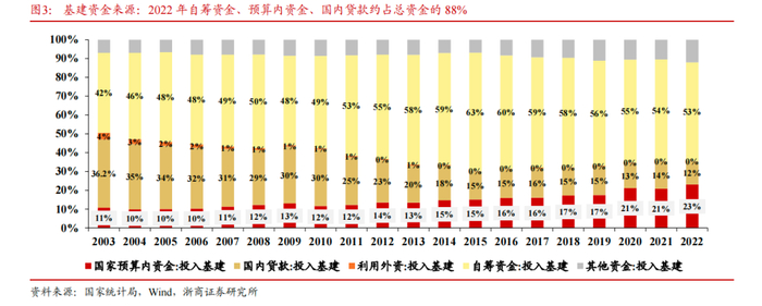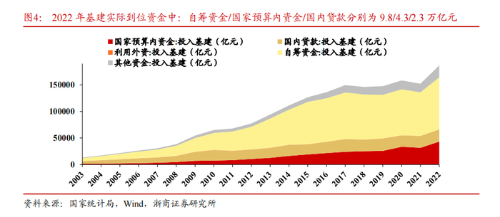 基建资金来源结构:我们梳理了近二十年的基建行业实际到位资金数据,国家预算资金、自筹资金、国内贷款是基建资金侧的三大主要来源,2022年占比合计约88%,其中占比最大的为自筹资金(53%),其次为国家预算内资金(23%),再次为国内贷款(12%)。我们提示,2011年后国家预算内资金投入基建资金占比持续提升,2022年投资占比已经提升约10个pct。