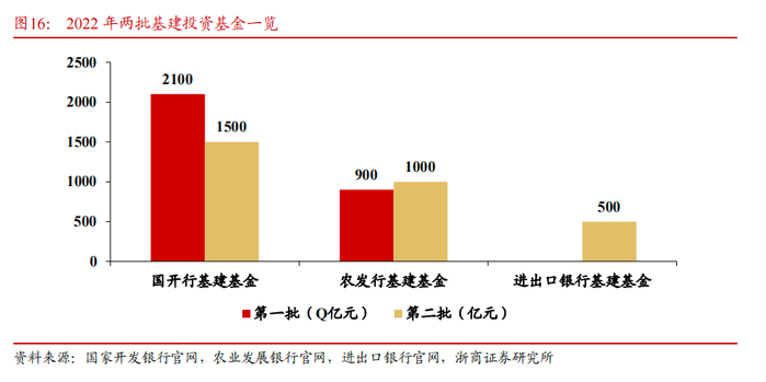 ①国开行基建基金:根据2022年9月国开行官网披露,国家开发银行在高效投放首批2100亿元国开基础设施投资基金的基础上,截至9月20日,国开基础设施投资基金已投放资本金3600亿元,支持项目超800个,其中8月24日国务院常务会议宣布的新增额度已投放1500亿元,支持项目421个。按照国务院有关部署,国开基础设施投资基金根据地方实际需求增加额度,优先支持“十四五”规划内、前期工作成熟、三季度能够尽快开工的基础设施重点领域项目,向主要经济大省倾斜,并进一步拓宽支持领域。
