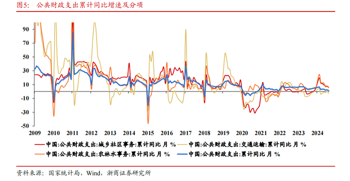 总结看,公共财政支出投向规模主要受政策导向性影响较大,例如2020-2021年抗疫阶段的公共财政基建支出整体性下降、2023年增发万亿国债后今年公共财政里基建支出出现的结构性分化。