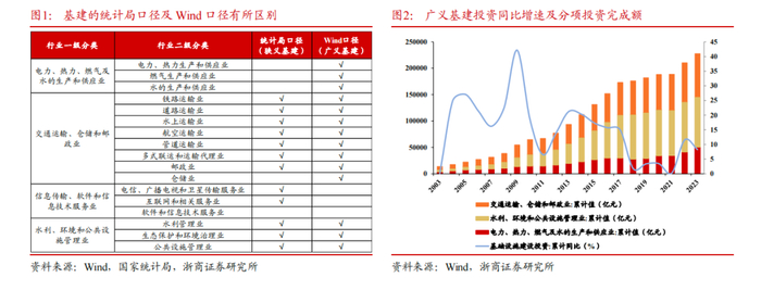 >>基建投资可分为广义基建(Wind口径)和狭义基建(统计局口径),主要区别在于覆盖行业范围不同,考虑数据的可回溯性,本文全文采用广义基建口径。