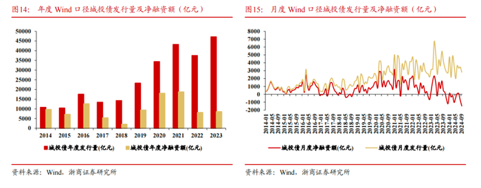 从Wind口径统计,2014年以来城投债年度发行量逐步提升,至2023年达到4.71万亿元,但从净融资角度看,2021年城投债净融资额便到达峰值为1.87万亿,随后两年城投债净融资额均不足0.9万亿,从月度净融资角度看,自2023年11月以来的10个月来看,仅有3个月当月城投债净融资为正,城投债大概率进入偿还周期。
