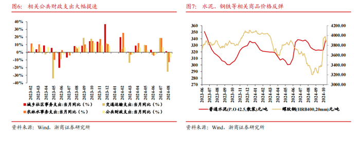 2024年4月18日,国家发展改革委副主任在国新办发布会上介绍今年2月国家发展改革委完成了全部3批共1万亿元增发国债项目清单下达工作,将增发国债资金落实到约1.5万个具体项目。2024年7月11日,新华社报道指出截至7月初,1.5万个项目已全部开工建设。总体看,收入端的政策导向会产生支出端的结构性变化,随着去年底增发国债资金的快速落地,去年11月起农林水/城乡社区的公共财政支出大幅提速,同时带动水泥、钢铁等相关商品价格止跌反弹。