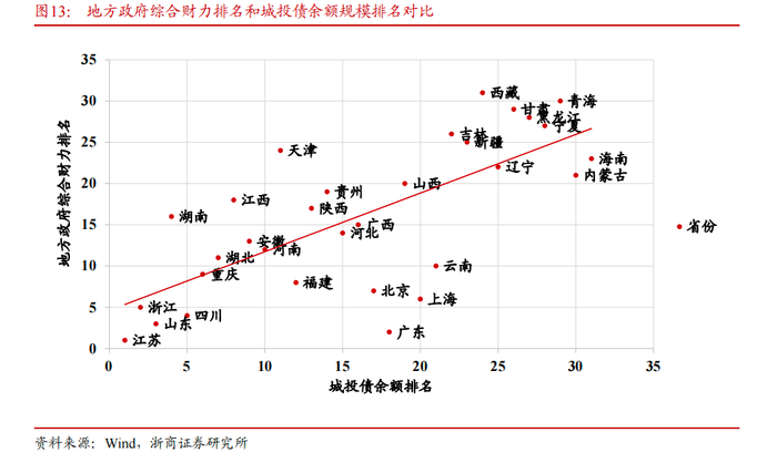 城投债资金大部分投向基础设施项目建设,各地城投债余额与各地方政府综合财力排名正相关,考虑到城投公司深度参与各地基建项目建设,项目单位投入基建的自筹资金中或有较大比例与城投债融资有关,城投债的发行规模和信用利差会受到所在地方政府的财政收入和经济实力影响,因此尽管自筹资金内不直接包括各类财政性资金,但其规模的扩张仍会受到地方财政实力制约。