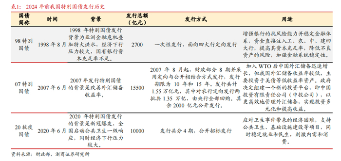 我国曾在1998年、2007年、2020年、2024年四次发行特别国债。1998年发行的特别国债用途为补充四大商业银行的资本金;2007年用途为注册成立中投公司,提高外汇资产运营收益,适度对冲增长过快的流动性,向央行购买外汇储备及中央汇金公司,其中部分国债在2017年和2022年到期,因此分别进行了续作;2020年的抗疫特别国债则是针对突发疫情的冲击,全部转给地方主要用于公共卫生等基础设施建设和抗疫相关支出。最近一次为今年两会期间提出的1万亿超长期特别国债,专项用于国家重大战略实施和重点领域安全能力建设。