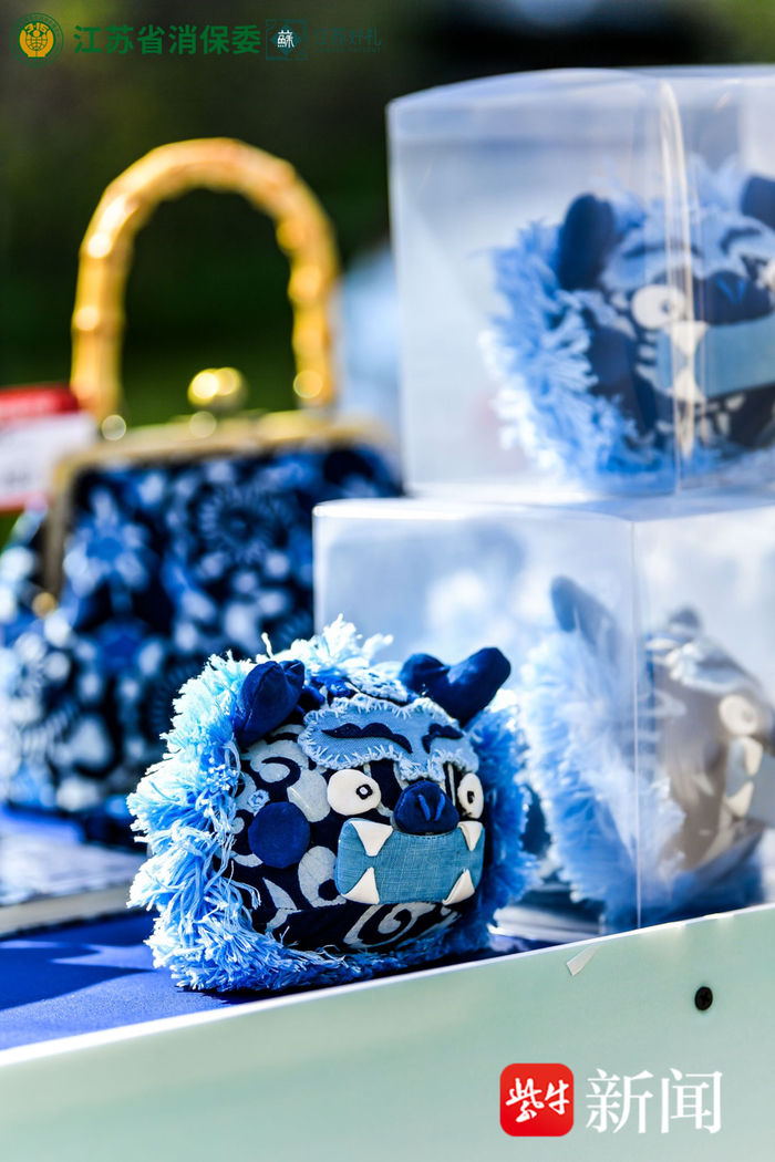 记者在现场看到,蓝印布偶“七色龙宝”,运用了手工染制出7种色阶的蓝印花布设计制作,巧妙地通过蓝白色的深浅变化对比,塑造出玩偶的立体形象。蓝色从深邃的靛蓝到淡雅的浅蓝,层次分明。龙宝的造型栩栩如生,圆滚滚的脑袋充满了俏皮与可爱。最终“七色龙宝”获得江苏特色好礼奖。