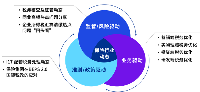 聚焦到税务视角,在税收征管变得更加智能化、金税四期等各类大数据管理方法层出不穷的大背景下,保险公司如何在这一阶段,积极优化税务工作流程与模式,降低税务合规风险,在更高效和更合规的税务管理基础上,利用好税务的“价值创造”功能,这已然成为各大保险企业税务管理工作亟需探索的核心方向。
