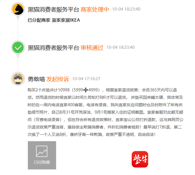 记者注意到,有消费者投诉中写道,自己刚买回家的床垫太硬不满意,一周内联系宜家售后退货,却遭遇到被打8折退款的问题。还有消费者投诉称,满足365天退货的家具,先被说订单太久,后又被说影响二次销售而被拒退款。