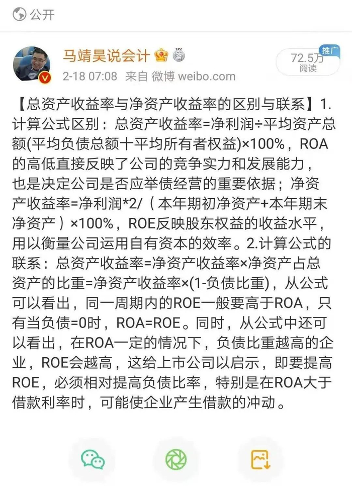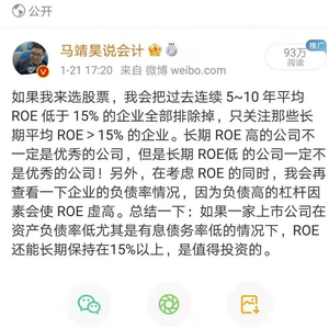马靖昊:净资产收益率ROE可能由于加了杠杆后而扭曲了企业的盈利能力,如何解决这一问题,我认为,总资产收益率ROA才是反映一家企业真实的盈利能力的指标,而这就是分析ROA的意义所在!