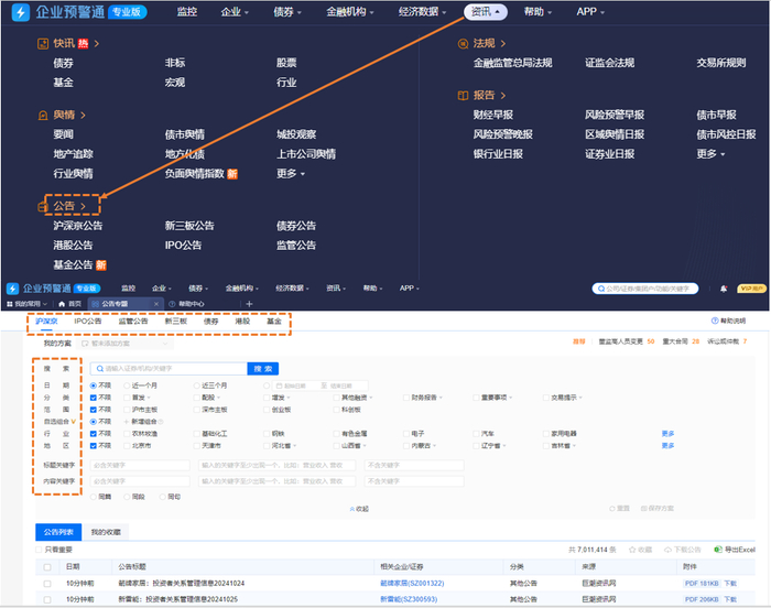 公告专题范围覆盖【沪京深】【IPO】、【监管】【新三板】【债券】【港股】【基金】七大维度,支持标题、正文、机构、关键词、筛选条件的复合条件检索。