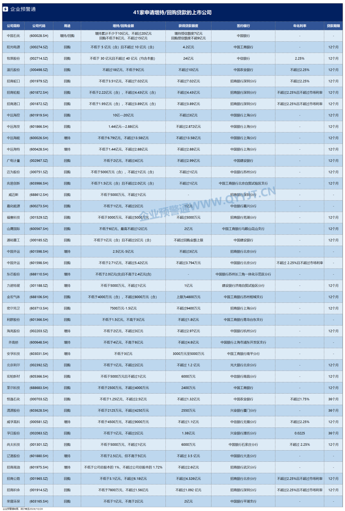 据企业预警通统计,截至10月24日晚间,加上招商南油、招商公路、孚日股份、中国外运、辽港股份等8家公司,目前共有41家上市公司及股东申请回购增持再贷款,累计贷款额的上限超过141亿元。