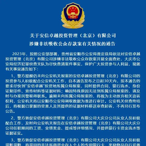 近日,大庆市公安局经济犯罪侦查支队发布《关于安信卓越投资管理(北京)有限公司涉嫌非法吸收公众存款案有关情况的通告》。