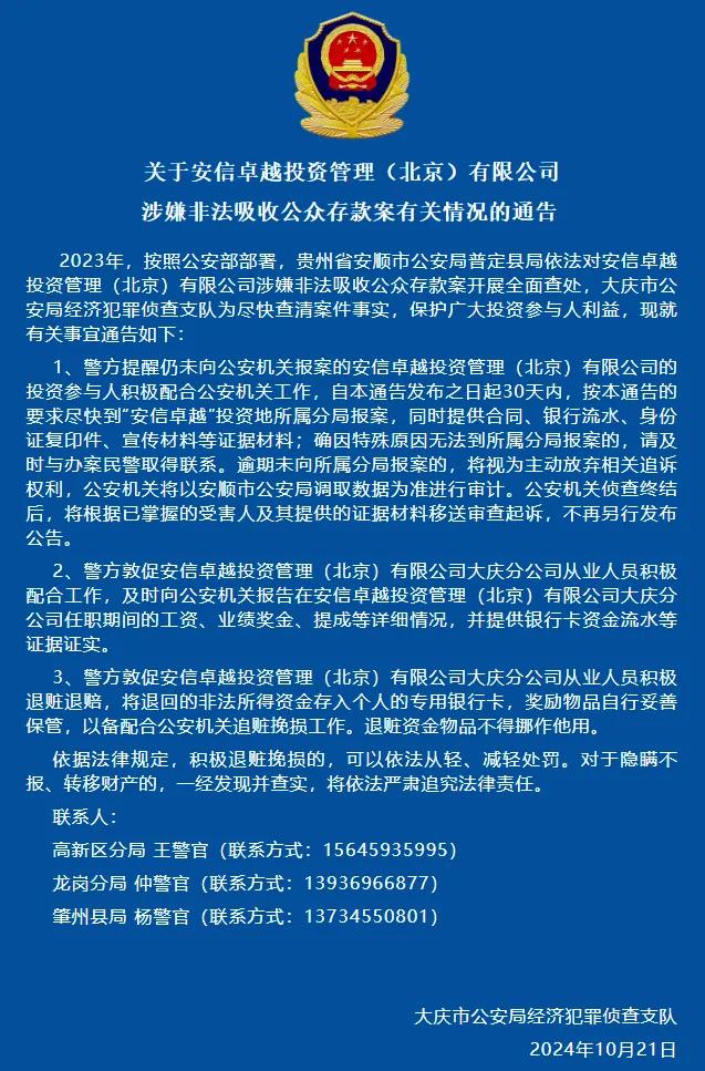 通告称,2023年,按照公安部部署,贵州省安顺市公安局普定县局依法对安信卓越投资管理(北京)有限公司涉嫌非法吸收公众存款案开展全面查处,大庆市公安局经济犯罪侦查支队为尽快查清案件事实,保护广大投资参与人利益,现就有关事宜通告如下: