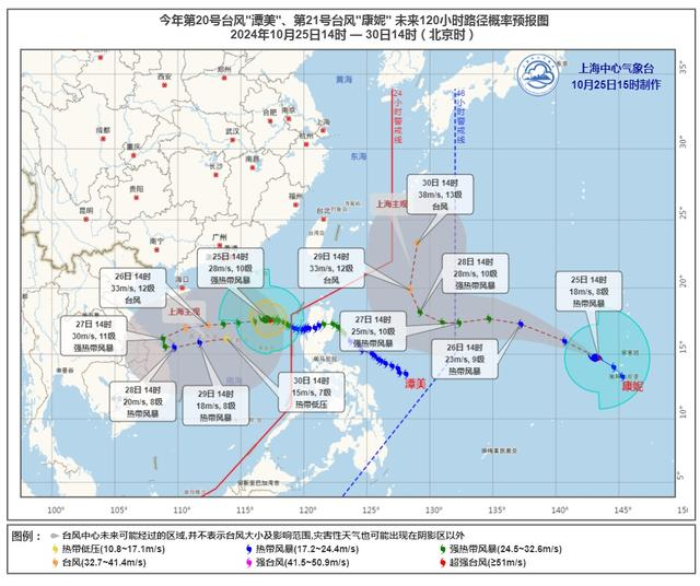 目前西北太平洋和南海区域有双台风活动,分别是今年第20号台风“潭美”和今年第21号台风“康妮”。