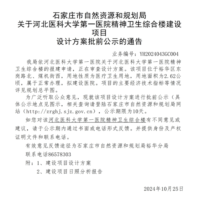10月25日,石家庄市自然资源和规划局网站对河北医科大学第一医院精神卫生综合楼项目设计方案进行批前公示。