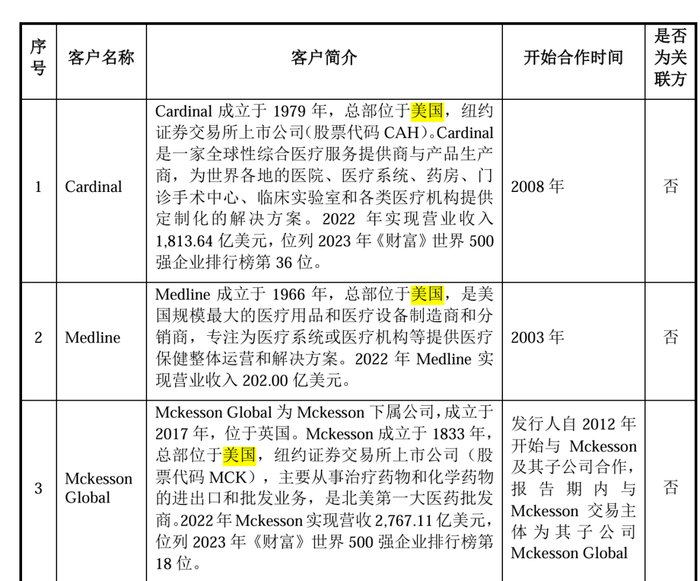 今年上半年,健尔康前五大客户分别为Caidinal、Medline、Owens & Minor、Mckesson Global 和Boston。这五家公司合计贡献了公司72.21%的营收。需要指出的是,上述前五大客户均是注册地或者总部位于美国。