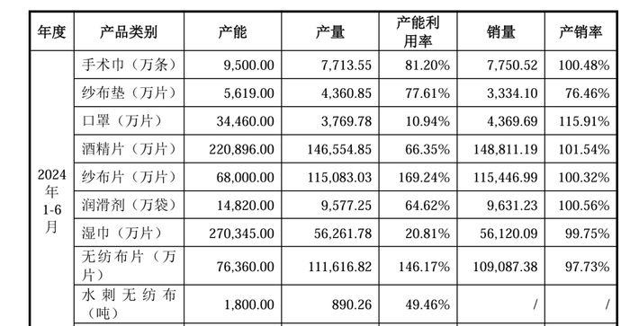 招股书显示,今年上半年,健尔康的口罩生产线的产能利用率只有11%左右,湿巾生产的产能利用率只有21%左右,水刺无纺布的产能利用率只有50%左右,而纱布垫的产能利用率也只有77%左右。只有无纺布片和纱布片的产能利用率高于100%。