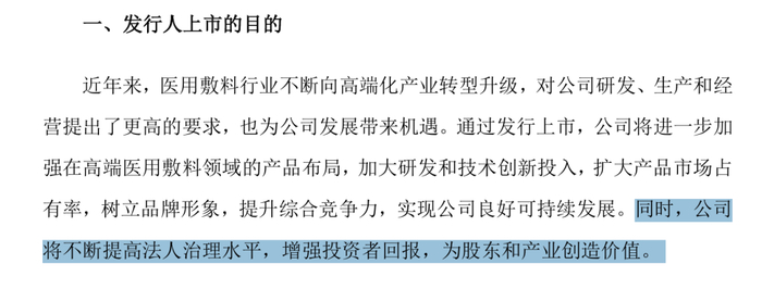 对于此次登陆A股,健尔康表示“通过发行上市,公司将进一步加强在高端医用敷料领域的产品布局,加大研发和技术创新投入,扩大产品市场占 有率,树立品牌形象,提升综合竞争力,实现公司良好可持续发展。同时,公司将不断提高法人治理水平,增强投资者回报为股东和产业创造价值。
