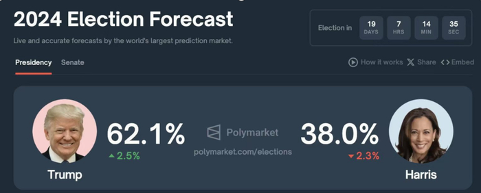 而最近有一个事,就是特朗普的选情有了明显的提升。之前特朗普和哈里斯一直是55开,有时候甚至哈里斯还能领先个2-3%,但上周在链上的博彩下注网站上突然有多个账户大单买入特朗普,导致他的胜率已经飙升到了62%以上。换言之,有大量的资金,在押注特朗普胜选。