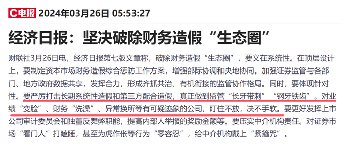 今年3月,中央级媒体——经济日报才发文针对上市公司业绩“变脸”提出了措辞严厉的社论文章。文章指出——要严厉打击长期系统性造假和第三方配合造假,真正做到监管“长牙带刺”“钢牙铁齿”。对业绩“变脸”、财务“洗澡”、异常换所等有可疑迹象的公司,盯住不放,决不手软。