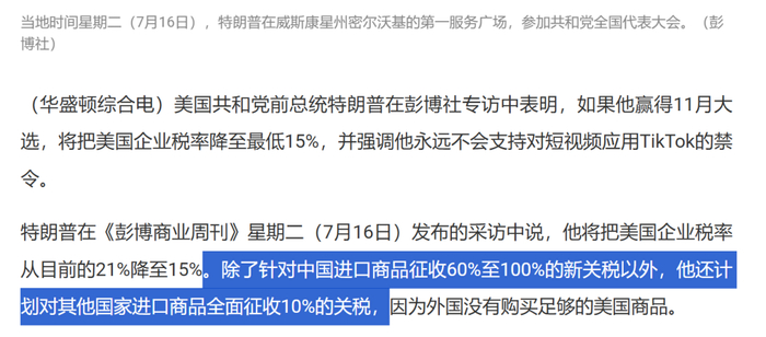 根据美媒报道,美国总统候选人之一特朗普表示,如果他赢得总统大选,他想对所有从中国进口的商品征收60%-100%的关税,并对来自其他国家的进口产品征收10%的关税,包括对欧盟,目的是优先发展美国工业。
