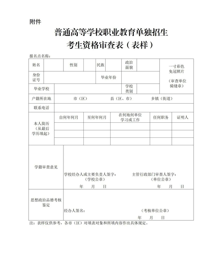 2.参加职业教育单招学生提供《普通高等学校职业教育单独招生考试资格审查表》 (附件2)