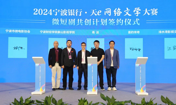 微短剧共创计划签约仪式上,甬派传媒、喜豹传奇、宁波财经学院、宁波微电影协会、宁波浅水湾影视文化产业园五方签约,启动微短剧共创计划。该计划旨在推动宁波以及长三角微短剧产业的繁荣发展,将通过各参与方的优势叠加,打造更多优秀的微短剧作品。同时,借助这一计划的深入推进,提升各方在微短剧领域的地位和口碑。