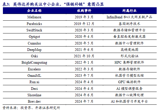 典型案例如英伟达(NVDA.O),其在2024年4月收购以色列人工智能初创企业Run:ai和Deci,旨在在于帮助客户更加有效地利用自家AI芯片产品;6月收购了Shoreline公司,其提供智能自动化解决方案,致力于提高基于云的服务的可靠性和效率;7月再次出手,收购初创公司Brev.dev,其主要提供AI和机器学习开发平台,可以在基于CPU和GPU的云实例上构建、训练和部署模型。通过吸纳被收购企业的技术和资源,英伟达加强了其数据中心业务,使其在AI时代能够更加精准地满足企业客户日益增长的复杂需求。从具体的收购对象来看,英伟达对与AI相关的名类软件和工具更感兴趣,且更加关注中小企业,“强链补链”意图凸显。