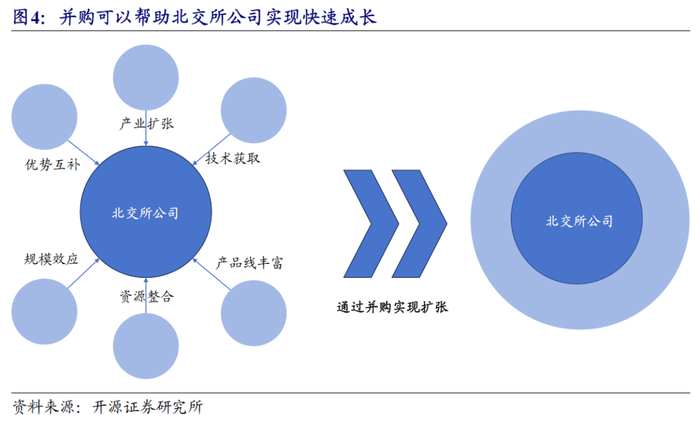 北交所上市公司多为创新型中小企业,业绩的增长来源除了新兴行业发展较快外,尤其对于竞争格局相对稳定的行业来说,企业积极拓展市场,提高渗透率与市场占有率是重要的业绩提升与信心来源。在快速发展过程中,通过并购的方式可以快速获得新市场空间、人才、运营经验,持续提升运营效率,实现弯道超车,同时,通过并购可以改善财务状况、增强持续盈利能力,突出主业、增强抗风险能力。