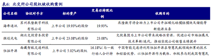 北交所战略新兴产业作为引领未来经济发展的新支柱,相关产业的央国企或将成为未来战略合作和多元化战略等的整合方向。过去,北交所也有国企收购案例,即2023年12月,湖北交投资本投资有限公司收购微创光电23.08%的股权,实控人变更为湖北省人民政府国有资产监督管理委员会,本次收购,交投集团旨在为上市公司带来战略性资源,促进公司市场拓展及技术革新/迭代,推动实现公司销售业绩提升。