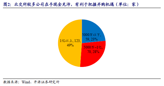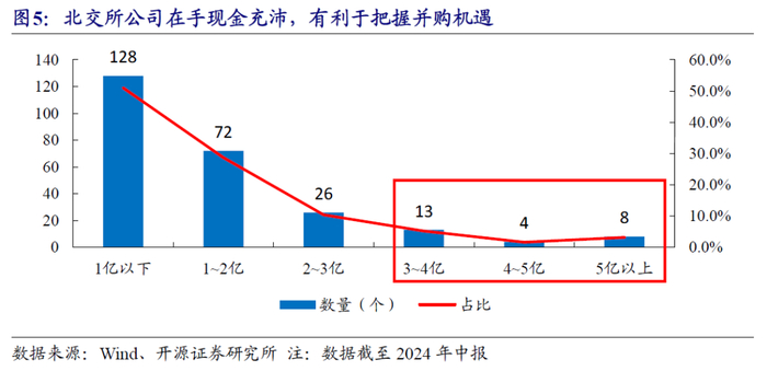 根据新华社《经济参考报》统计,截至2024年8月底,北交所自开市以来,上市公司累计披露了107单购买资产的公告,交易金额平均为5700万元。目前来看,北交所公司并购案例中,现金收购是并购支付中的主要方式,特别是刚上市不久拥有充沛的现金,是当前支撑北交所公司及时把握并购机遇的重要前提条件。截至2024年中报,北交所公司共有123家期末现金及现金等价物余额在1亿元以上,占比约为48.8%,可见北交所较多公司现金较为充裕,有利于把握并购机遇。