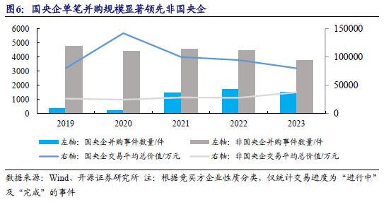 纵观A股市场历年的并购重组活动,我们可以发现一个显著的趋势:自2021年起,国央企作为竞买方参与的并购重组案例数量有了显著增长。这些国央企不仅在并购活动中更为活跃,而且在交易价值上也表现出了更大的手笔。相较于非国央企的并购案例,国央企的并购交易总价值的平均值通常更高,这反映出国央企在并购交易中的平均单笔投资规模更大。