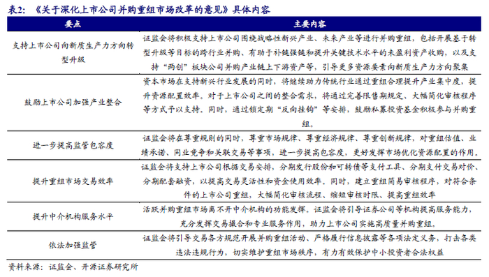 新“国九条”对活跃并购重组市场做出重要部署,为进一步激发并购重组活力,2024年9月24日,证监会发布《关于深化上市公司并购重组市场改革的意见》(下称《意见》或“并购六条”),针对当前并购重组市场存在的问题提出了一系列针对性的举措,既体现了政策的包容性,又兼顾市场的稳定性。具体来看,证监会将积极支持上市公司围绕战略性新兴产业、未来产业发展进行并购,包括开展区域转型升级等目标的跨行业并购,以及有助于补链强链、提升关键技术水平的未盈利资产收购。为活跃并购重组市场,证监会将建立重组简易审核机制,对符合条件的上市公司重组大幅简化审核流程,缩短审核时限,提高审核效率。