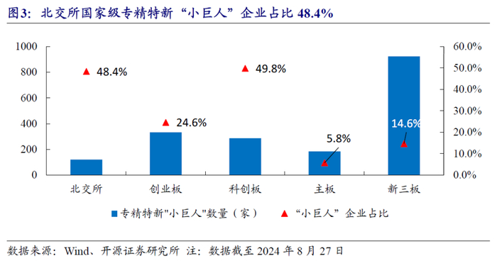 北交所专精特新企业占比较高,是新质生产力的重要承载平台。截至2024年9月26日,253家北交所公司中有104家为专精特新企业,占比41.1%,略低于科创板占比(45.7%)。