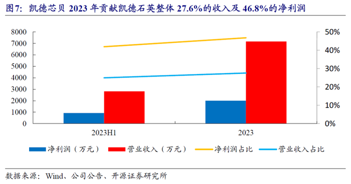 通过这次并购,凯德石英能够利用芯贝伊尔在冷加工领域的技术优势,与自身的火加工产品形成互补,从而提供更全面的石英制品解决方案,并有助于凯德石英在半导体行业的布局更加完善,不仅提升了公司服务现有客户的能力,也为开拓新的市场空间和增长点提供了动力。2023年,凯德芯贝营业收入7171.04万元,净利润2001.89万元,占凯德石英公司整体的比重分别为27.6%、46.8%,可见其对于凯德石英收益能力的贡献。