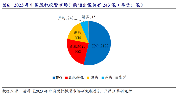 在IPO节奏放缓的背景下,并购方式退出或成为中国股权市场退出方式的新机会,且对于资本市场的高质量发展和市场生态的良性发展都具有重要意义。根据清科《2023年中国股权投资市场研究报告》,2023年中国股权投资市场共发生3946笔退出案例,同比下降9.6%,其中通过被投企业IPO方式退出案例共2122笔,同比下降21.3%,并购退出案例共243笔。相比之下,根据Pitchbook统计,2023年美国股权投资市场有95%的退出案例是通过并购类退出的方式(统计口径为并购+股权转让+回购)实现的,因此并购退出的占比在中国股权投资市场仍有较大的上升空间。