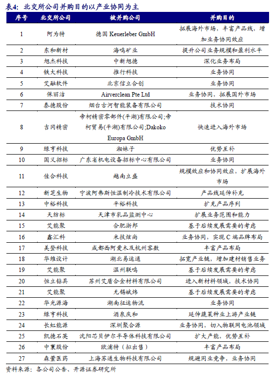 聚焦核心产业链,产业协同成为北交所公司并购重组的主要目标,成功案例涌现。在当前北交所的收购案例中,大部分公司目前收购的目标都是与核心业务展开协同、拓展海外市场以及产业链整合。对于处于成长期的北交所公司来说,并购可以帮助快速实现业务的多元化和优化,通过收购具有互补性的业务,企业能够增强自身的核心竞争力。对于寻求进入新兴行业或市场的企业,并购是一种高效的途径,能够帮助企业快速站稳脚跟,抓住行业发展的先机。总的来说,通过并购,北交所公司可以进入新的市场或获取新的客户群体,从而开辟额外的收入来源。