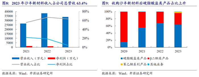 沙丰新材料主营业务为脂肪酸盐、脂肪酸酯产品及其混合物的研发、生产、应用、销售及技术服务。2021-2023年,沙丰新材料收入分别占公司总营收55.4%、67.0%、63.4%,净利润分别占公司总体净利润的22.0%、18.9%、4.0%(2023年沙丰新材料净利润下降原因系竞争加剧导致产品销售均价同比下滑较大所致)。2021年起,佳先股份由于此次收购,硬脂酸盐板块营收占比快速提高,2020-2023年硬脂酸盐营收占比分别为14.9%、54.6%、67.2%、63.4%。