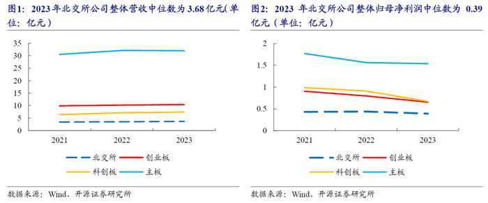 北交所上市公司主要集中在成长期阶段,收入规模和业务体量尚小。2023年北交所公司整体营收中位数3.68亿元,归母净利润中位数0.39亿元,低于科创板、创业板及主板。