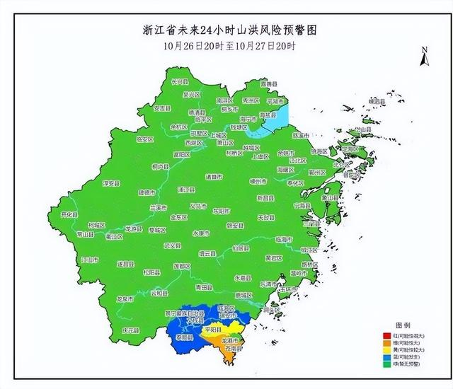 省水利厅、省气象局10月26日17时12分联合发布山洪灾害预警:根据省气象台未来降雨预报,预计10月26日20时至10月27日20时,苍南县发生山洪灾害可能性大(橙色预警),平阳县发生山洪灾害可能性较大(黄色预警),文成县、泰顺县、瑞安市可能发生山洪灾害(蓝色预警)。