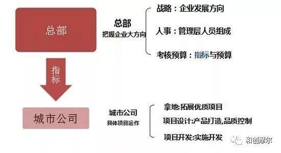 华润置地采取”总部+城市+项目”两层管理制度,总部对于城市公司使用战略型管控模式,以指标考核作为管控落脚点。