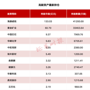 百亿私募高毅资产旗下产品现身海康威视、紫金矿业、中国巨石等上市公司前十大流通股名单中,合计持有市值约235亿元。重阳投资旗下产品三季度现身移远通信、新和成2家上市公司前十大流通股名单中,合计持有市值超6亿元。