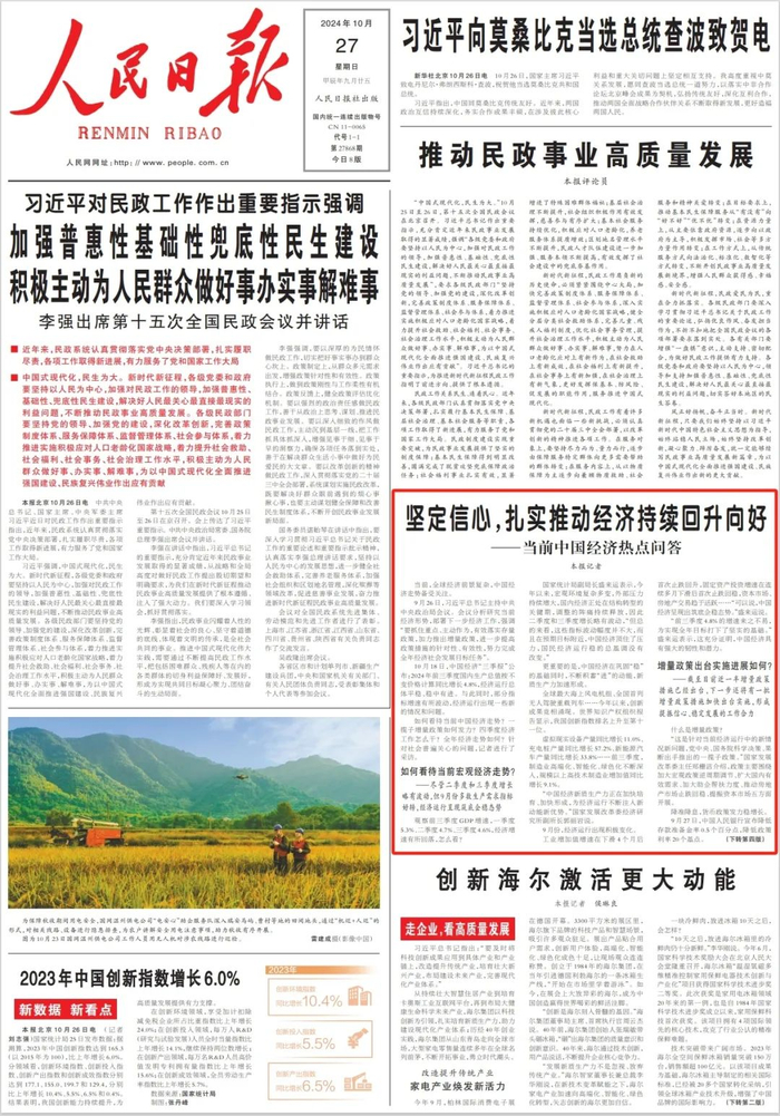 如何看待当前中国经济走势?一揽子增量政策如何发力?四季度经济工作怎么干?全年经济走势如何?针对社会普遍关心的问题,今日出版的人民日报刊发文章《坚定信心,扎实推动经济持续回升向好——当前中国经济热点问答》进行解读。