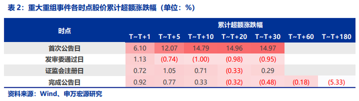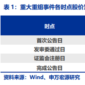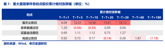上市公司重大重组一般会经历以下几个时点:1)首次公告日,即重大资产并购重组公告首次披露日期,这也是市场投资者第一次获得新信息的时点。重组预案包含较为丰富的新增信息,并且能反映出公司未来的战略规划,投资者会根据上述内容调整预期,从而影响股价走势。2)发审委审核通过日、证监会注册日,即相应交易事件通过交易所、证监会审核的日期,但由于重大重组支付方式各有不同,而部分交易形式不需要经历外部审核,该时点样本主要为定增重大重组事件。3)完成公告日,即重组事件实施完成的公告披露日。