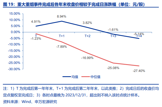 上市公司完成重大重组后二级市场股价整体小幅下行。以各时点的收盘价计,在涨跌幅均值方面,重大重组完成日后第一年、第二年年末相较于完成日股价有所上涨,但自第四年起不及完成日的股价表现,第五年年末股价相较于完成日下跌5.14%;而涨跌幅中值整体呈下行趋势,且跌幅相对较大,完成日后第三年相较于完成日下跌16.99%,完成日后第五年相较于完成日下跌27.40%。