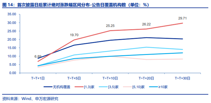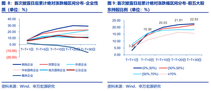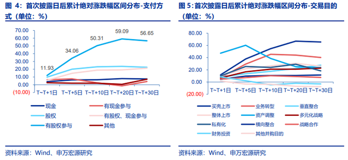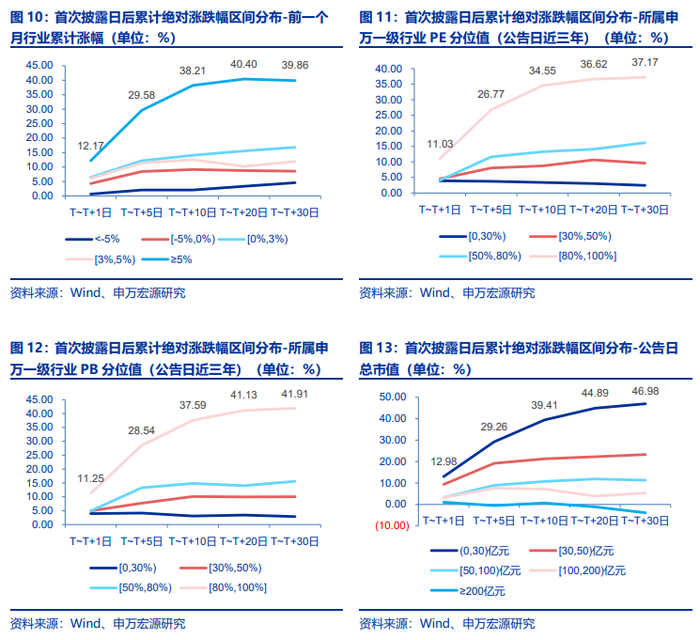在个股估值上,首次披露日总市值规模与其公告日效应负相关,市值在100亿元以下的上市公司在事件窗口期各时间段上涨家数均超过50%,其中30亿元以下的领先。