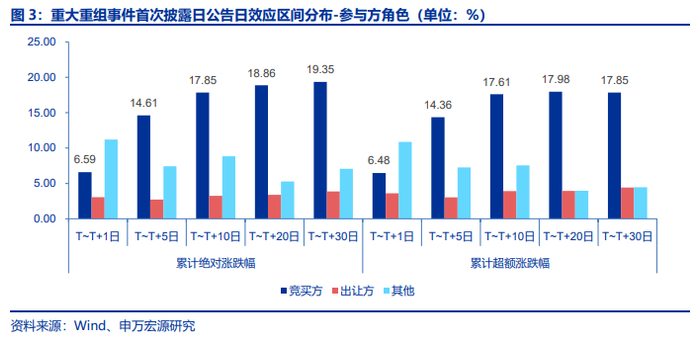 由于重大重组事件中各类参与方角色存在明显差异,其中上市公司作为竞买方购入资产,不考虑买壳上市情形,能够凸显其业务扩张的战略需求,而上市公司作为出让方卖出资产,会促使投资者重新评估其剥离该资产后的未来发展。