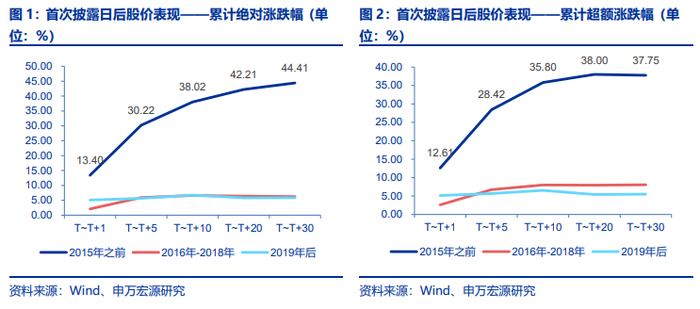 2.1 首次公告日股价正向效应明显,注册制试点后整体减弱