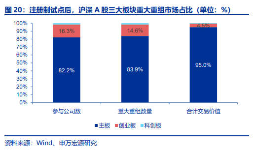 目前,主板上市公司是重大重组市场的主力军,上市公司参与数量、重大重组完成数量、交易金额占比均超过80%,其中交易金额占比达到95%。主板定位“大盘蓝筹”,该板块的上市公司除了拥有更丰富的资源和更强的整合能力外,在其所处的成熟期行业赛道中,更有可能面临行业升级的挑战,对应资源整合需求更大,因而市场占比较高。而双创板块,尤其是科创板,上市公司往往处于成长期的战略新兴产业,其进行产业整合的需求相对较小。