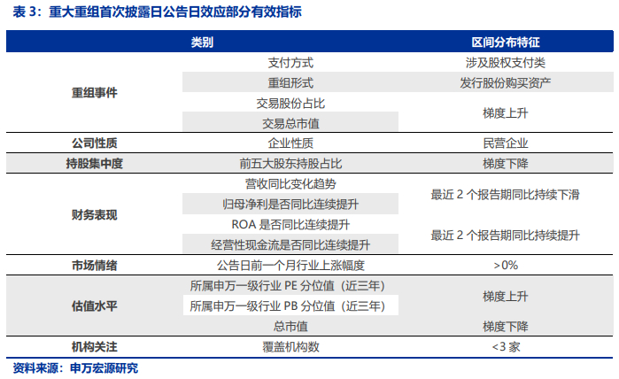竞买方公告日效应更强的个股特征:1)重组事件:涉及股权交易、交易规模及总价值较大;2)公司性质:民营企业;3)持股集中度:集中度较低的企业;4)财务表现:业绩表现不佳,但归母净利润下滑对其资产回报率的冲击较小,同时现金流管理能力出现了边际改善趋势;5)市场情绪及估值水平:上市公司在行业上行阶段公布预案,市场反响较好,但披露日总市值与公告日效应负相关;6)机构关注:有机构覆盖但覆盖数量较少。